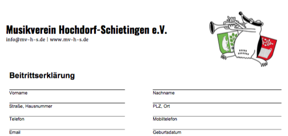 Du möchtest aktives Mitglied werden oder den Musikverein als passives Mitglied unterstützen? Dann kannst du hier unsere Beitrittserklärung herunterladen und ausfüllen. Abgeben kannst du sie bei allen Vereinsmitgliedern.
